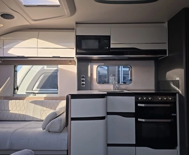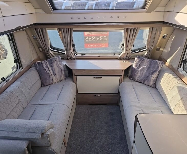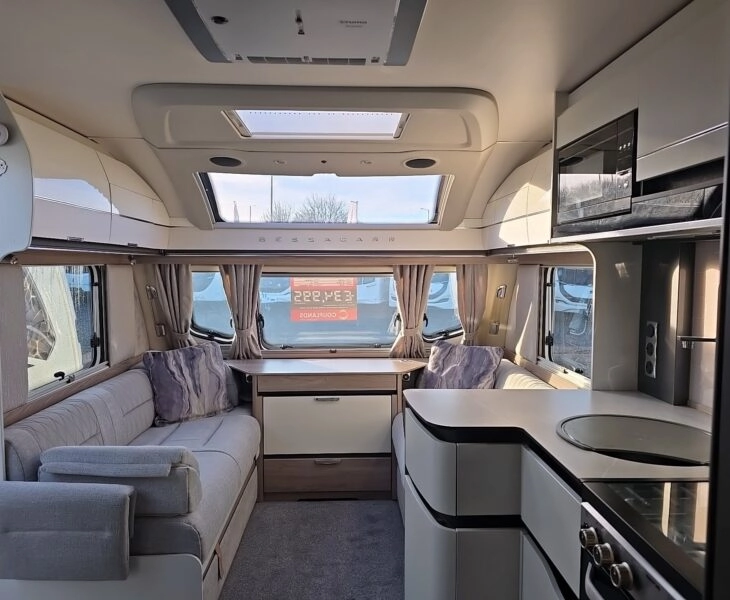 Exclusive features : Unique embroidered door way mat with the Bessacarr logo, Parallel seating area with unique upholstery scheme, 5G Wi fi system. Swift command control panel. Kitchen has Truma Aventa Air con, branded splashback, Extractor fan, Microwave, Fridge with freezer compartment, Water heater and Oven. Additional baskets in the kitchen cupboards.
