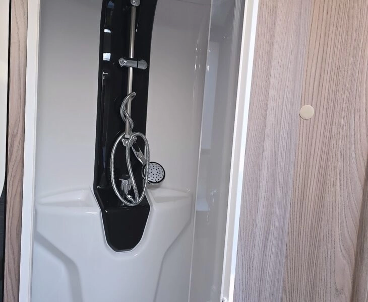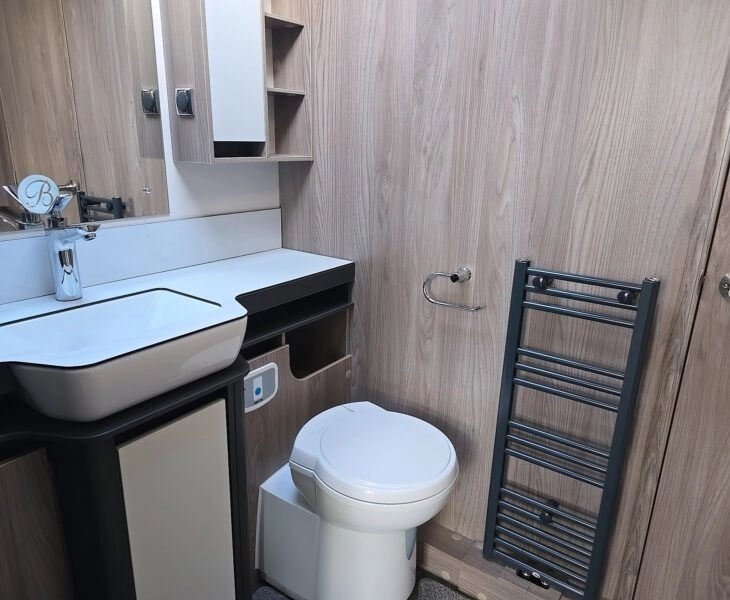 Door leading into the spacious bathroom, enjoy a lovely shower with the Alde flow and on board water tank, Cassette toilet and luxurious sink and vanity area. Access to wardrobe.