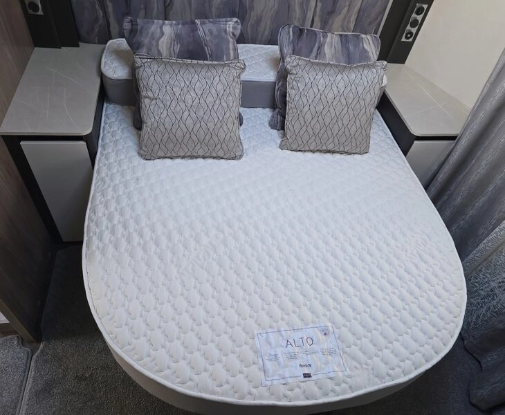 Bedroom features a double side transverse bed, Sun roof, Heki rooflight, bedside cabinets and wardrobes.