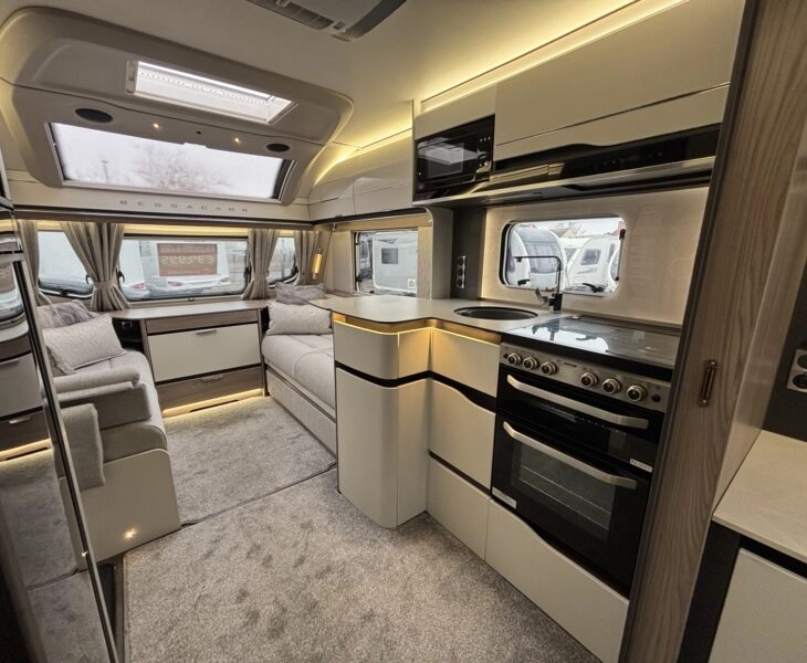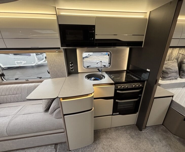 The fully equipped kitchen includes a dual-fuel hob, oven and grill, microwave, extractor fan and tall fridge freezer, providing everything required for self-sufficient touring. Climate control is enhanced with fitted Truma air conditioning, ensuring a comfortable environment during warmer weather, complemented by Alde wet central heating and underfloor heating for all-season use.
