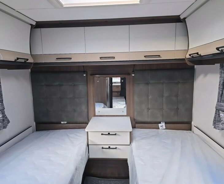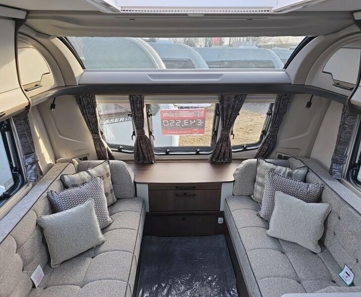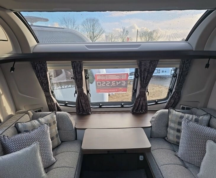 Laser 865 Xtra is a premium 8-ft wide twin-axle caravan offering a spacious, high-spec layout with twin fixed single beds, a centre washroom, and a large front lounge that converts into an extra double.
