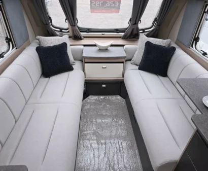 The Lusso 2 is 8-ft-wide, Luxury caravan featuring a spacious L-shaped front lounge, mid kitchen, a comfortable transverse island bed, full end washroom.