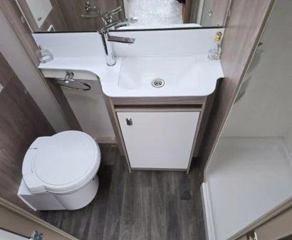 The island bed offers great comfort, and the rear washroom includes a full-size shower and contemporary fittings.