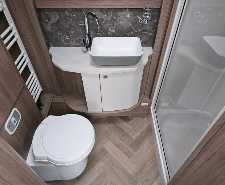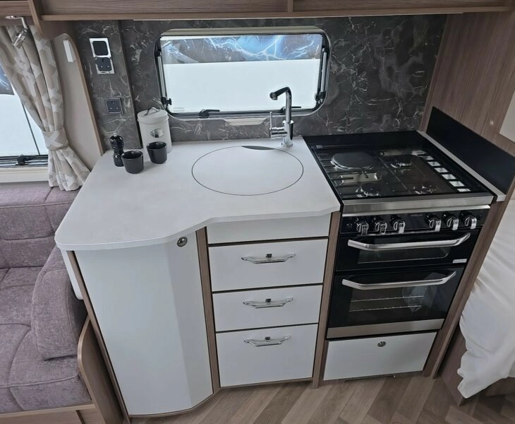 Enjoy year-round touring with Alde wet central heating, excellent insulation, and a fully bonded body shell backed by a 10-year water ingress warranty. The VIP 565 also comes equipped with ATC trailer control, an alarm system, flyscreens, pleated blinds, and a contemporary kitchen with ample worktop space.