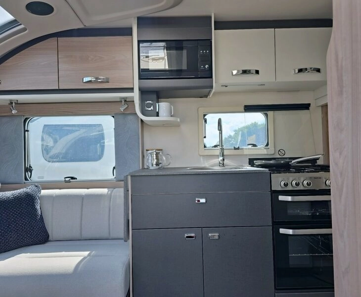 The well equipped kitchen includes a Thetford oven/grill with 3 burner gas hob and 1 electric hotplate,Thetford 142 litre tall fridgewith15 litre freezer compartment, TRUMA CombiNeo heating system delivering quick and continuous hot water insulation. Control system with 4″ LCD managing battery, lighting, water and environment.