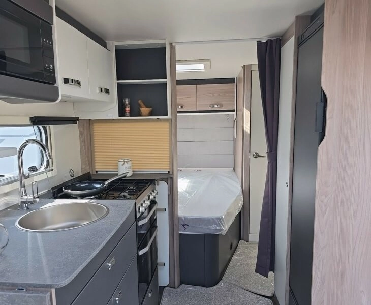 A Modern and practical 4 berth caravan boasting practicality and value. Featuring a rear fixed island bed, a mid washroom with separate shower and a beautiful bright front lounge that converts into a double bed.