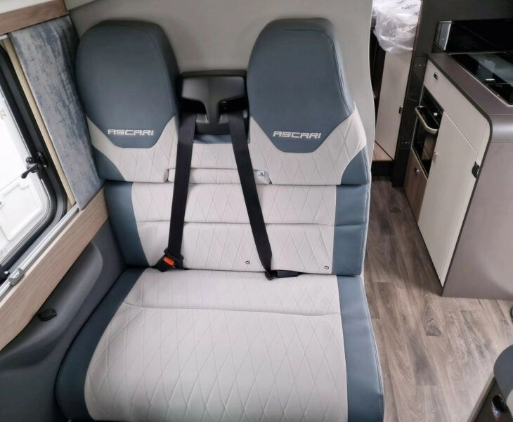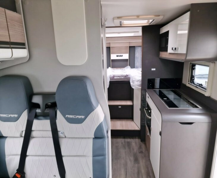 The Ascari is a narrow coachbuilt motorhome. Streamlined and nimble, it’s similar in size to a panel van giving extra driving confidence to anyone new to motorhome travel. Complete with a sleek exterior and a stylish, modern interior, it’s filled with all the travelling essentials and more. New external BBQ point, Cold water shower point and external 240v socket. 16″ alloy wheels, 100w solar panel, Euro 6D Final 140bhp, 2.2 litre engine with 6-speed manual gear box and ESC & Eco Packs as standard. ESC includes: anti-slip regulation (ASR), roll over mitigation (ROM) and hill holder. ECO includes; stop and start system, smart alternator and more effective energy saving fuel pump. 75L fuel tank and AD-blue based after treatment system with 19L tank