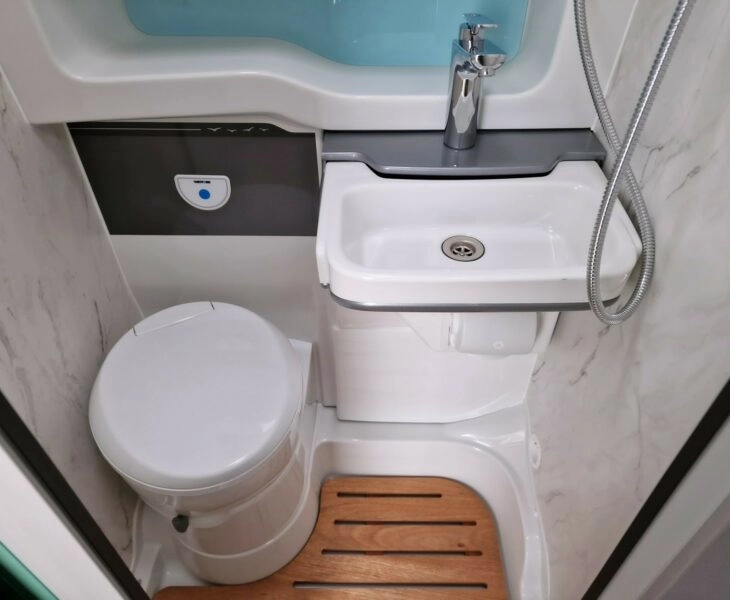 Washroom and shower tray with foldaway washbasin and separate Vector vanity tap. Vector shower mixer with Ecocamel Jetstorm showerhead and retainer, with on/off button for a powerful shower that uses less water. Thetford cassette toilet with electric flush and 18 litre wheeled tank and concealed waterproof toilet roll holder