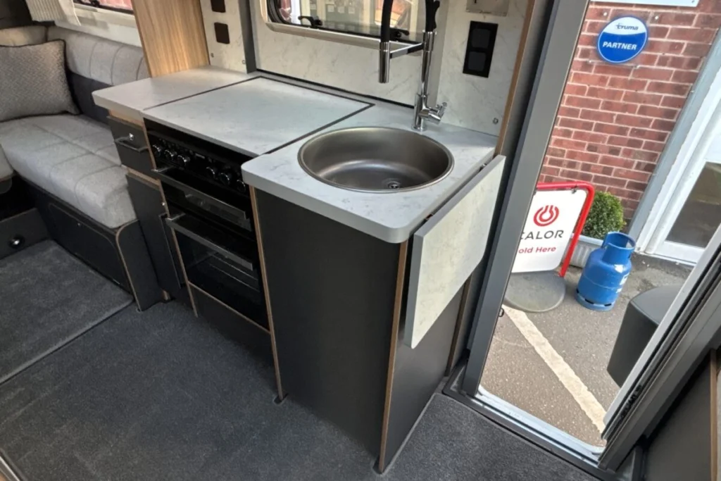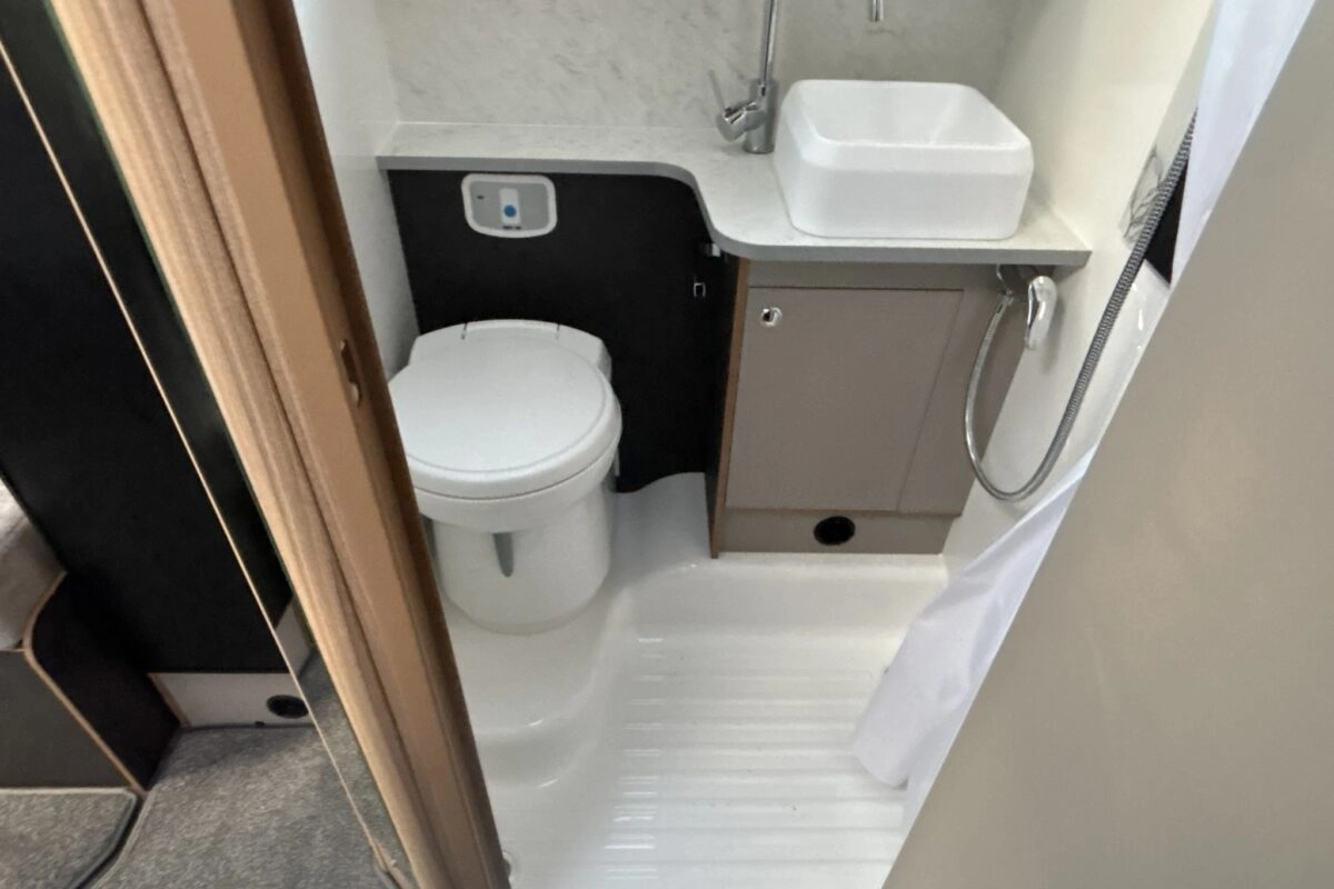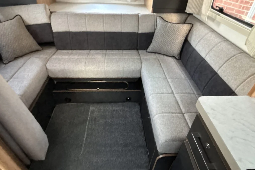 Truma 200 Watt Solar Panel, 105AH Leisure Battery, Truma Combi 6E boiler with blown air, Large Thetford 150L Compressor Tower fridge, Twin Aguti converting travel seats, Thetford Gas Oven, grill and hob with 3 burners, Battery Charger, White marble kitchen worktops, Good sized rear garage with access from both inside and outside lockers, Electric flush toilet.