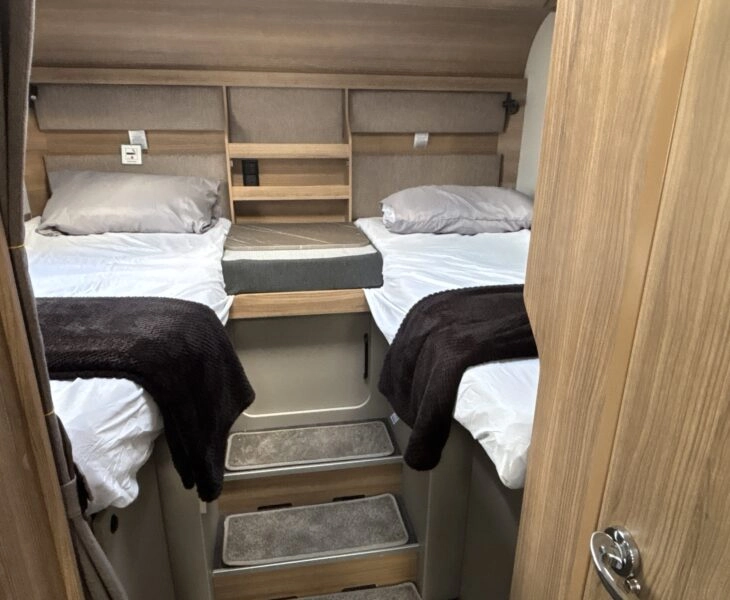 This model has the front lounge twin travel seats with the circular adjustable table, both front cab seats swivel for the ultimate practical living area. The Central washroom closes off to the front with its solid door and has a good sized separate shower opposite the Electric flush toilet, wash basin and large mirrored vanity unit. Fixed single beds to the rear with cushions making up into a double bed if required, amble storage for all of your extra nice to haves.