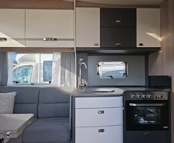 Kitchen is ready for action with its Thetford oven and grill, three burner gas hob with electric hotplate, and a tall Dometic fridge with 133 litres of storage space, including a 12 litre removable freezer compartment.