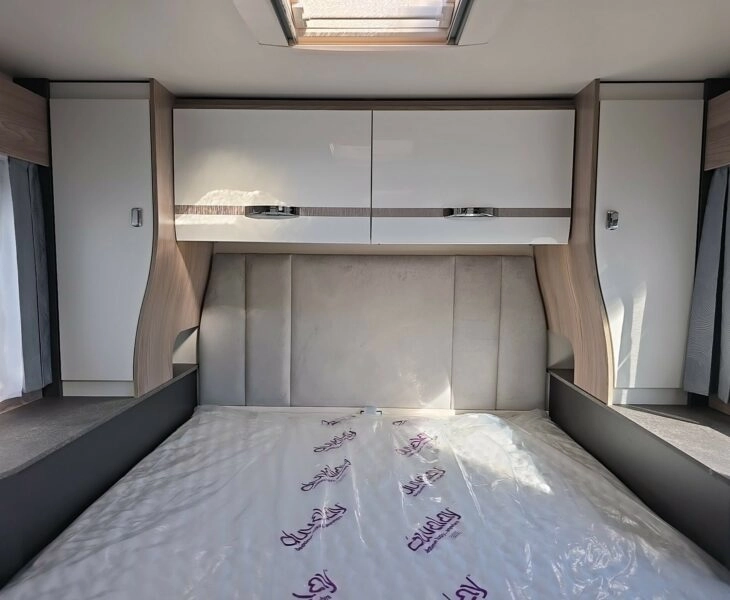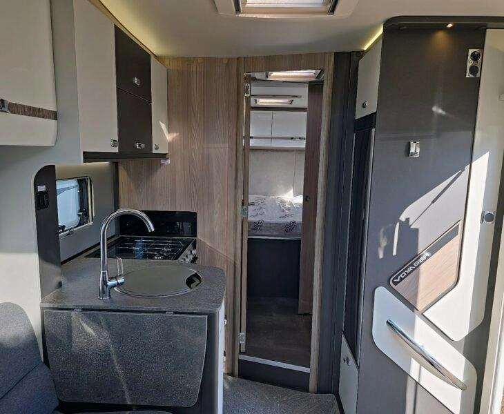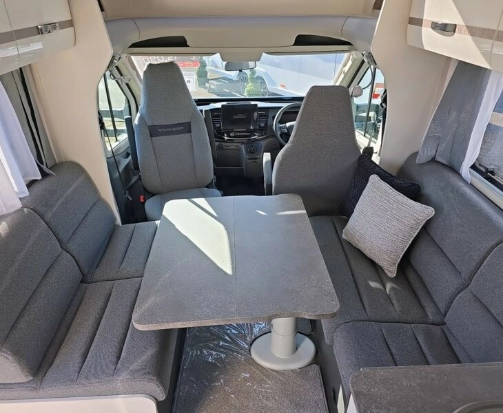 Motorhome comprises of revolving captain’s chairs plus an electric rise & fall dining table, helping to make Voyager the ultimate leisure vehicle for families and people who like to entertain guests and it weighs 3500kg and can be driven on a standard licence. 70L fuel tank and AdBlue based after treatment with 24L tank. Smart construction with full GRP bodyshell, opening panoramic sunroof, Distinctive streamlined exterior front profile. 16″ alloy wheels, external BBQ point, External cold shower, tyre pressure monitoring system, low energy LED lighting, 120w solar, rear reversing camera, rear garage with lighting. Bike fixing rail (exc. 574 model)