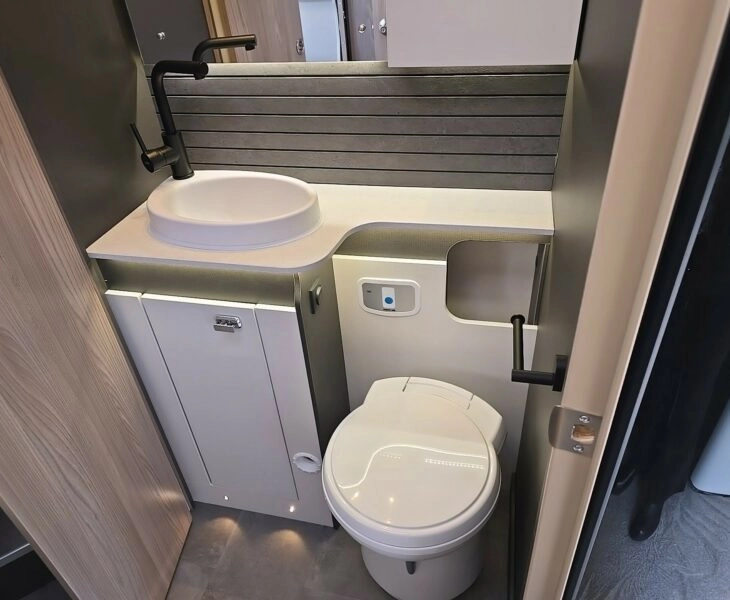 Washroom has combined vanity unit and sink bowl, toilet and separate shower (excluding 574 model), Tambour washroom door, Ecocamel Jetstorm showerhead, gloss white vanity bowl, Thetford cassette toilet with electric flush and 18litre wheeled tank.